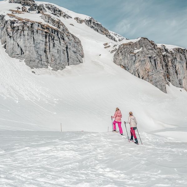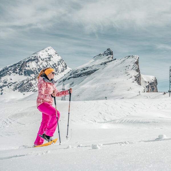 At an elevation of 2,350 meters, a vast snowy landscape opens up on the plateau. Here, you can set out on marked trails or join a guided snowshoe tour off the beaten path. Introductory snowshoe courses will give you the confidence and skills you need for independent tours in winter terrain.