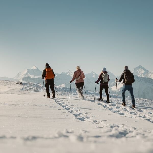 The marked trails lead through open snowfields, along gentle ridges, and offer impressive views of the surrounding mountains of the Matterhorn region. The trails are suitable for beginners as well as experienced snowshoers.