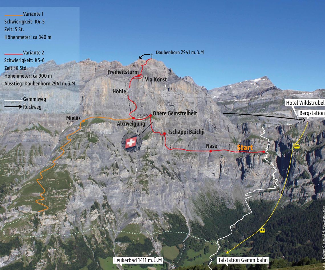 As a complete novelty, Leukerbad offers the breathtaking “Gemmiwand” to climbers. With uncountable carbines and hundreds of meters of ropes and ladders the climbing wall was built in autumn 1998. It’s a must for every moutainlover to go for this great trip. Our local mountain guides are pleased to take you for this adventure.